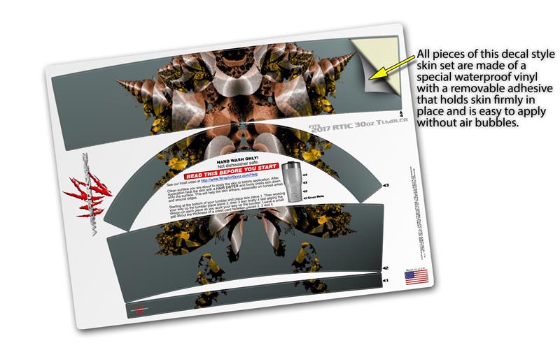 WraptorSkinz® skin wraps for 2017 RTIC Tumblers are printed using superb photo quality designs and vibrant colors printed with special fade resistant inks that last even in direct sun for years. WraptorSkinz® are a composite of two layers of commercial grade materials. The bottom layer is a soft, flexible vinyl with a special removable adhesive that is easily positioned, applied without air bubbles. Next we print the bottom layer with UV protected, fade resistant inks that deliver superb photo quality designs in vibrant colors. Finally we bond a professional grade laminate over the entire skin adding a glossy protective finish.