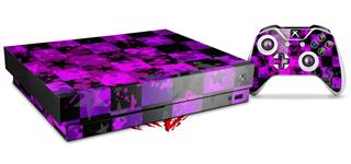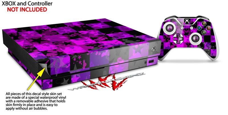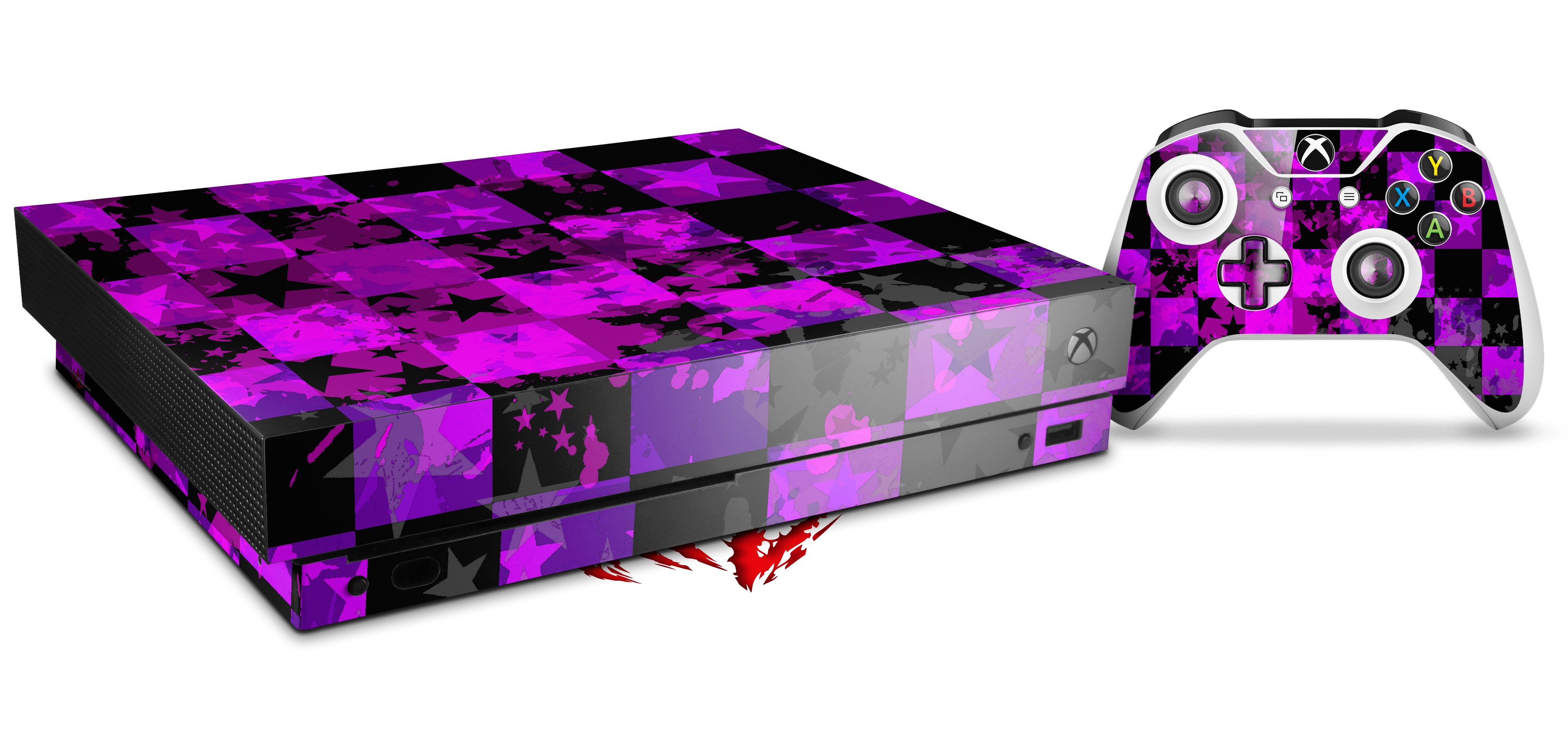 Skin Wrap for XBOX One X Console and Controller Purple Star Checkerboard