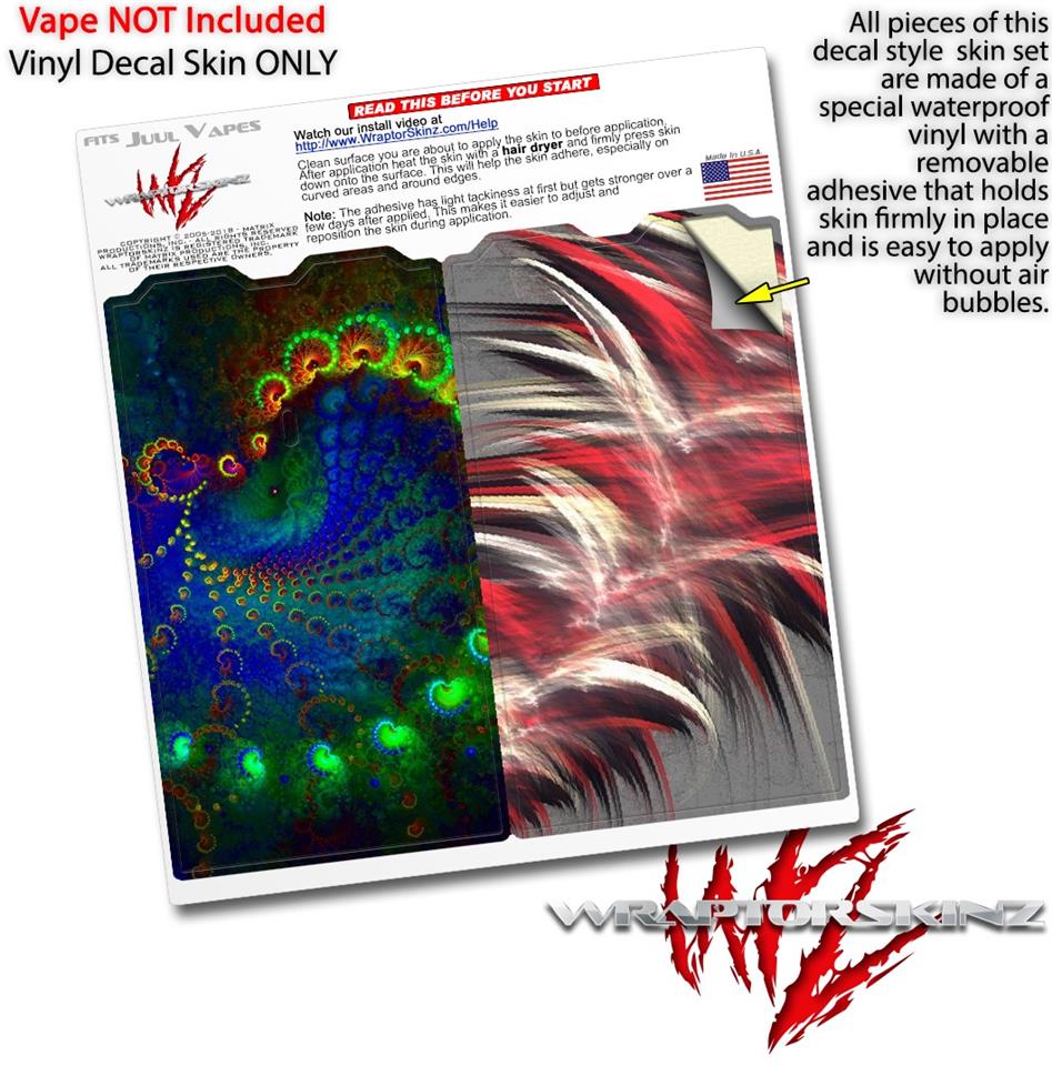 WraptorSkinz® skin wraps are printed using superb photo quality designs and vibrant colors printed with special fade resistant inks that last even in direct sun for years. WraptorSkinz are a composite of two layers of commercial grade materials. The bottom layer is a soft, flexible vinyl with a special removable adhesive that is easily positioned, applied without air bubbles. Next we print the bottom layer with UV protected, fade resistant inks that deliver superb photo quality designs in vibrant colors. Finally we bond a professional grade laminate over the entire skin adding a glossy protective finish. This product is not affiliated with or endorsed by the Juul brand.