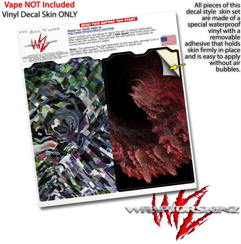 WraptorSkinz® skin wraps are printed using superb photo quality designs and vibrant colors printed with special fade resistant inks that last even in direct sun for years. WraptorSkinz are a composite of two layers of commercial grade materials. The bottom layer is a soft, flexible vinyl with a special removable adhesive that is easily positioned, applied without air bubbles. Next we print the bottom layer with UV protected, fade resistant inks that deliver superb photo quality designs in vibrant colors. Finally we bond a professional grade laminate over the entire skin adding a glossy protective finish. This product is not affiliated with or endorsed by the Juul brand.