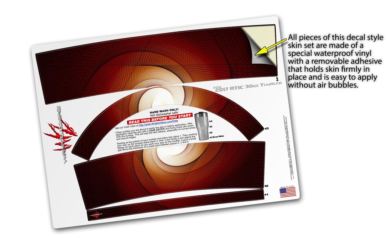 WraptorSkinz® skin wraps for 2017 RTIC Tumblers are printed using superb photo quality designs and vibrant colors printed with special fade resistant inks that last even in direct sun for years. WraptorSkinz® are a composite of two layers of commercial grade materials. The bottom layer is a soft, flexible vinyl with a special removable adhesive that is easily positioned, applied without air bubbles. Next we print the bottom layer with UV protected, fade resistant inks that deliver superb photo quality designs in vibrant colors. Finally we bond a professional grade laminate over the entire skin adding a glossy protective finish.