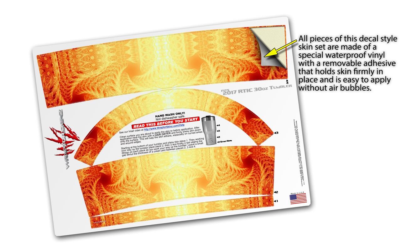 WraptorSkinz® skin wraps for 2017 RTIC Tumblers are printed using superb photo quality designs and vibrant colors printed with special fade resistant inks that last even in direct sun for years. WraptorSkinz® are a composite of two layers of commercial grade materials. The bottom layer is a soft, flexible vinyl with a special removable adhesive that is easily positioned, applied without air bubbles. Next we print the bottom layer with UV protected, fade resistant inks that deliver superb photo quality designs in vibrant colors. Finally we bond a professional grade laminate over the entire skin adding a glossy protective finish.