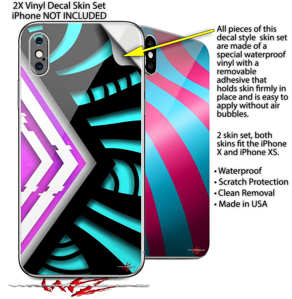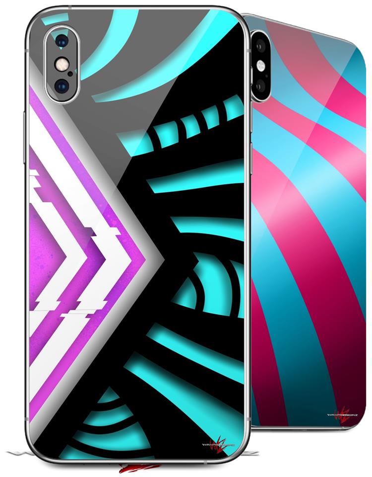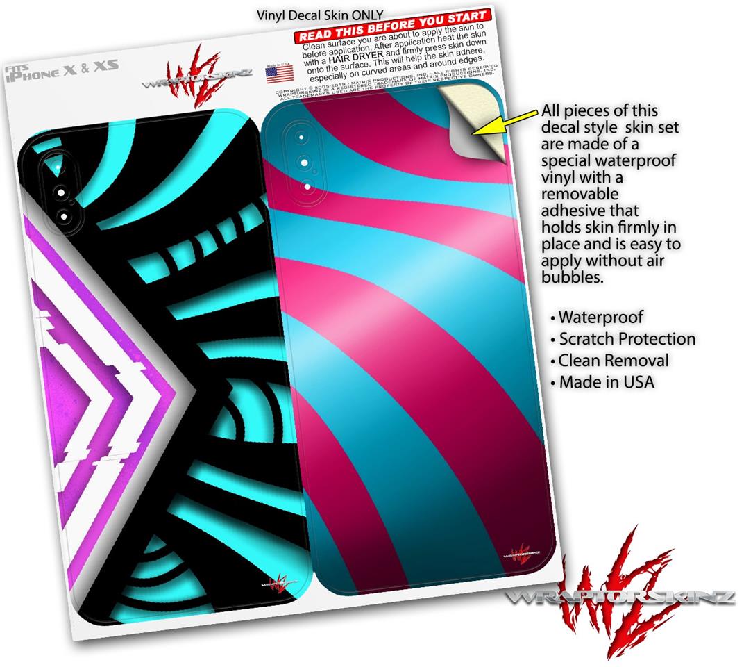 2 Decal style Skin Wraps set for Apple iPhone X and XS Black Waves Neon Teal Hot Pink