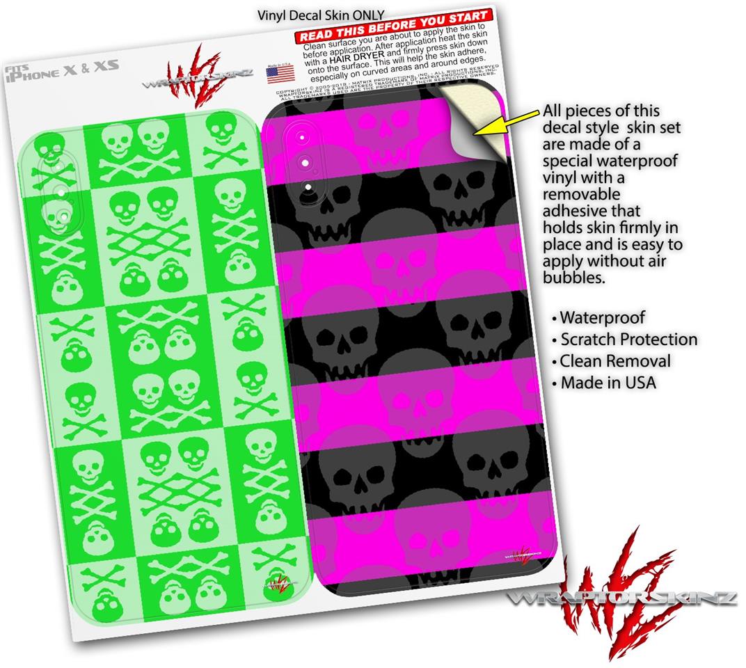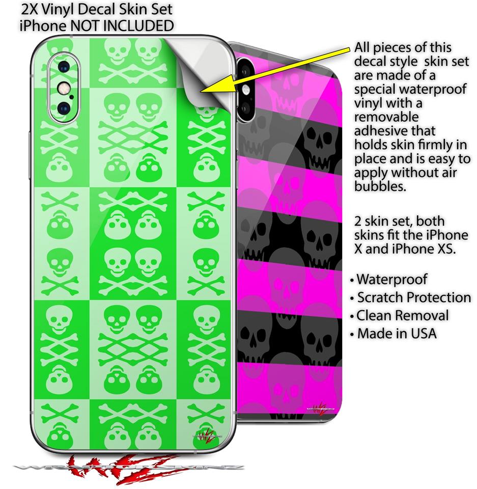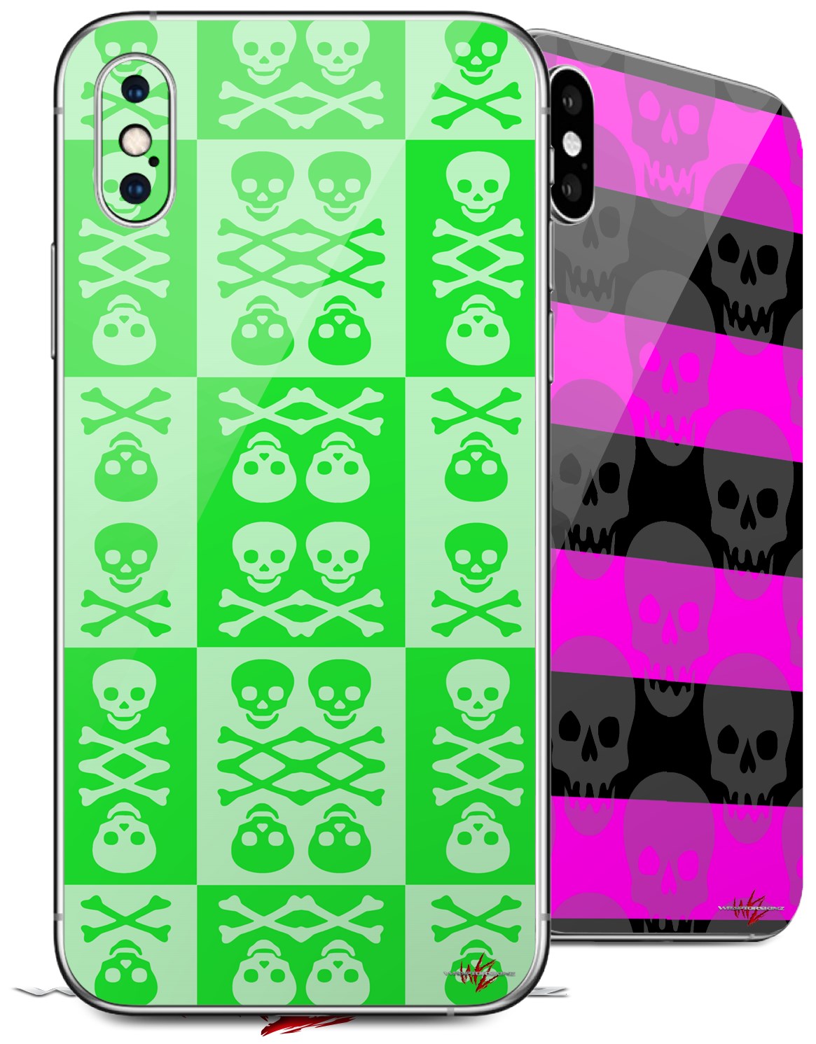 2 Decal style Skin Wraps set for Apple iPhone X and XS Skull And Crossbones Pattern Green