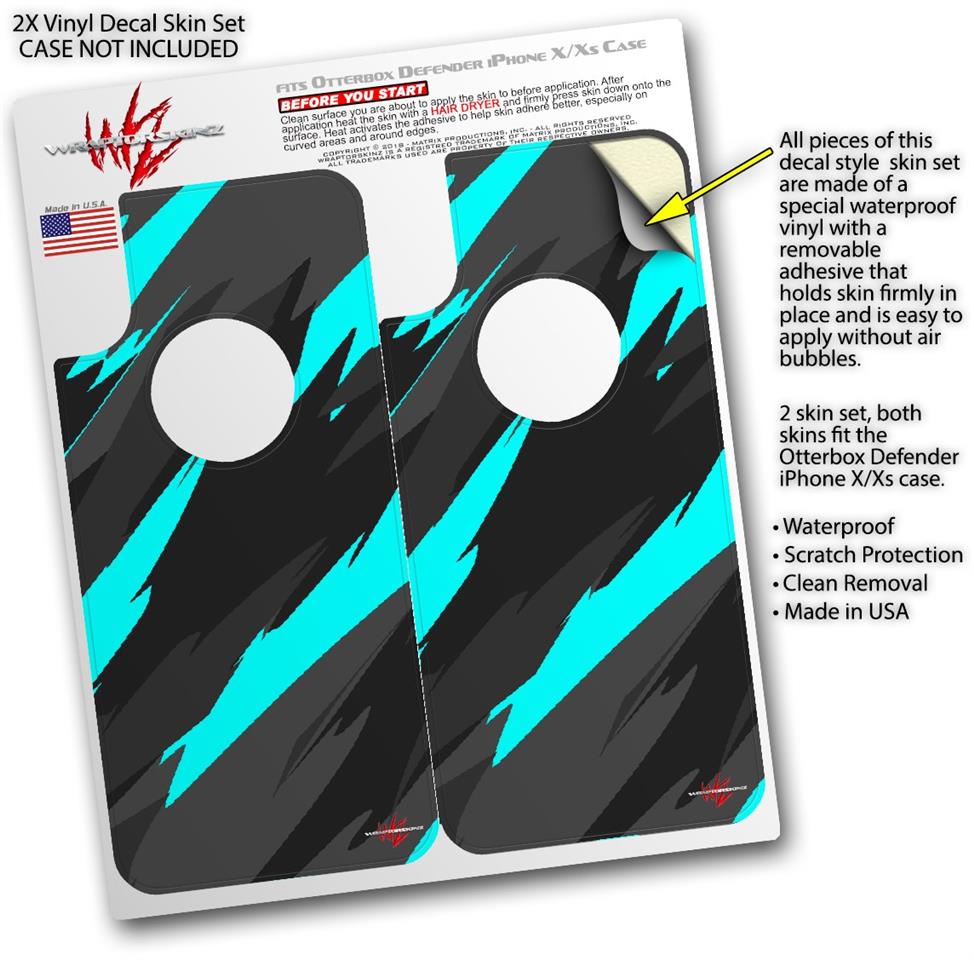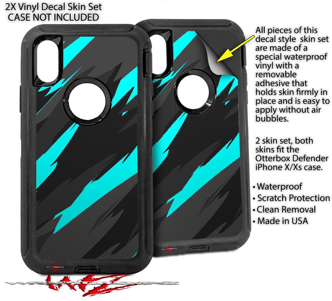 2x Decal style Skin Wrap Set compatible with Otterbox Defender iPhone X and Xs Case - Jagged Camo Neon Teal (CASE NOT INCLUDED)