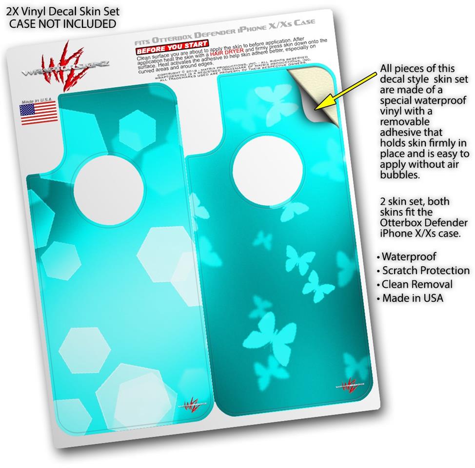 2x Decal style Skin Wrap Set compatible with Otterbox Defender iPhone X and Xs Case - Bokeh Hex Neon Teal (CASE NOT INCLUDED)