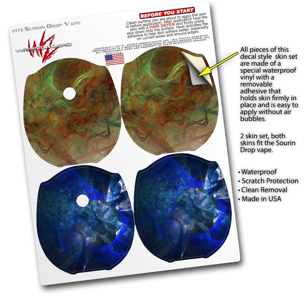 WraptorSkinz® skin wraps compatible with Suorin Drop Vape are printed using superb photo quality designs and vibrant colors printed with special fade resistant inks that last even in direct sun for years. WraptorSkinz are a composite of two layers of commercial grade materials. The bottom layer is a soft, flexible vinyl with a special removable adhesive that is easily positioned, applied without air bubbles. Next, we print the bottom layer with UV protected, fade resistant inks that deliver superb photo quality designs in vibrant colors. Finally, we bond a professional grade laminate over the entire skin adding a glossy protective finish. This product is not affiliated with or endorsed by Suorin.