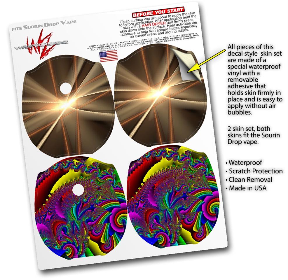 WraptorSkinz® skin wraps compatible with Suorin Drop Vape are printed using superb photo quality designs and vibrant colors printed with special fade resistant inks that last even in direct sun for years. WraptorSkinz are a composite of two layers of commercial grade materials. The bottom layer is a soft, flexible vinyl with a special removable adhesive that is easily positioned, applied without air bubbles. Next, we print the bottom layer with UV protected, fade resistant inks that deliver superb photo quality designs in vibrant colors. Finally, we bond a professional grade laminate over the entire skin adding a glossy protective finish. This product is not affiliated with or endorsed by Suorin.