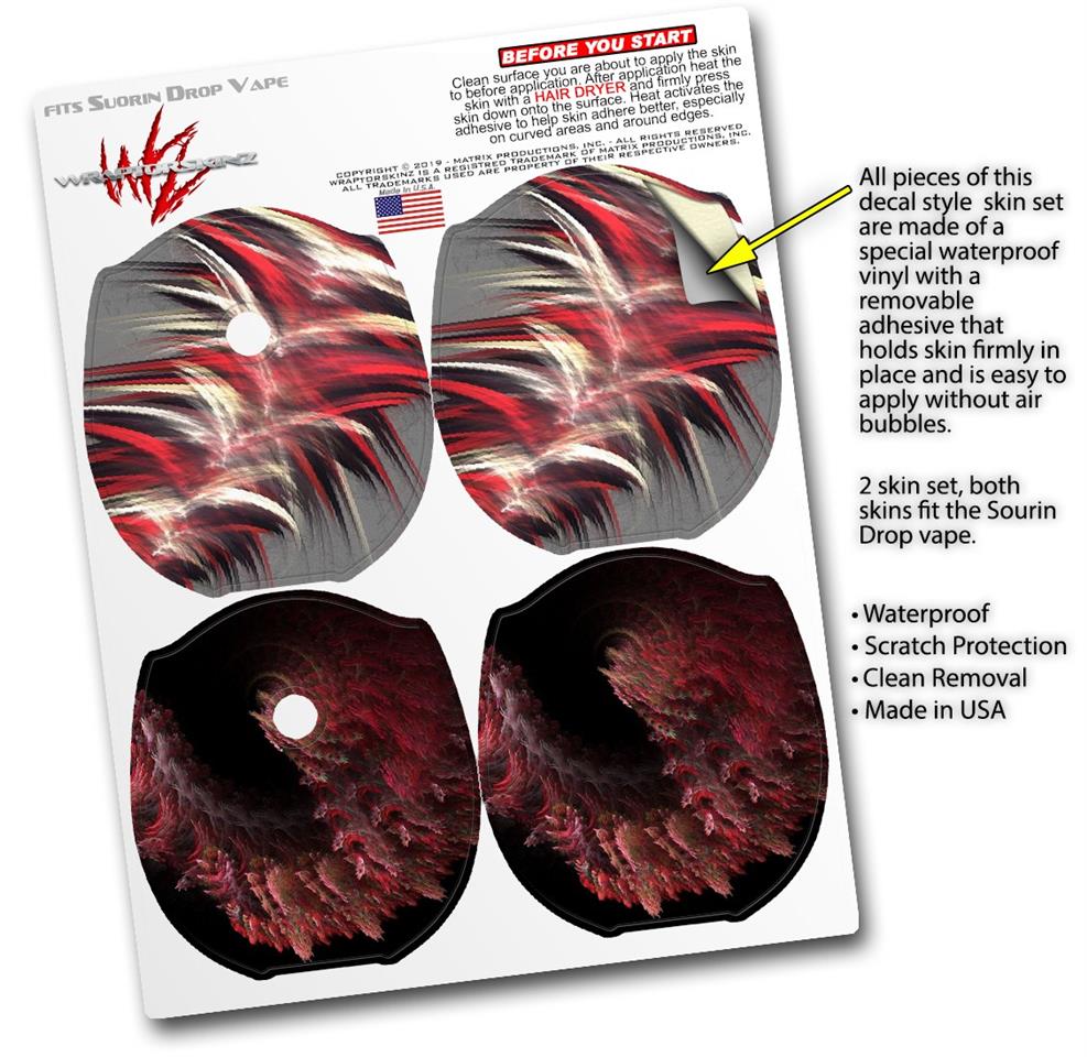 WraptorSkinz® skin wraps compatible with Suorin Drop Vape are printed using superb photo quality designs and vibrant colors printed with special fade resistant inks that last even in direct sun for years. WraptorSkinz are a composite of two layers of commercial grade materials. The bottom layer is a soft, flexible vinyl with a special removable adhesive that is easily positioned, applied without air bubbles. Next, we print the bottom layer with UV protected, fade resistant inks that deliver superb photo quality designs in vibrant colors. Finally, we bond a professional grade laminate over the entire skin adding a glossy protective finish. This product is not affiliated with or endorsed by Suorin.