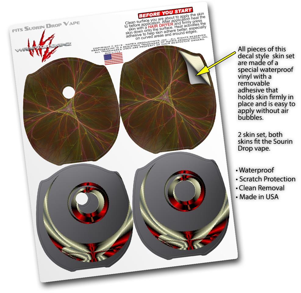 WraptorSkinz® skin wraps compatible with Suorin Drop Vape are printed using superb photo quality designs and vibrant colors printed with special fade resistant inks that last even in direct sun for years. WraptorSkinz are a composite of two layers of commercial grade materials. The bottom layer is a soft, flexible vinyl with a special removable adhesive that is easily positioned, applied without air bubbles. Next, we print the bottom layer with UV protected, fade resistant inks that deliver superb photo quality designs in vibrant colors. Finally, we bond a professional grade laminate over the entire skin adding a glossy protective finish. This product is not affiliated with or endorsed by Suorin.