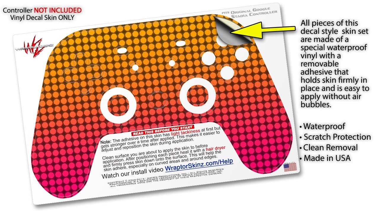 This product is in no way affiliated with or endorsed by Google. WraptorSkinz® skin wraps work with the Original Google Stadia version 1 Controller. Printed using superb photo quality designs and vibrant colors printed with special fade resistant inks that last even in direct sun for years. WraptorSkinz are a composite of two layers of commercial grade materials. The bottom layer is a soft, flexible vinyl with a special removable adhesive that is easily positioned, applied without air bubbles. Next, we print the bottom layer with UV protected, fade resistant inks that deliver superb photo quality designs in vibrant colors. Finally, we bond a professional grade laminate over the entire skin adding a glossy protective finish.
