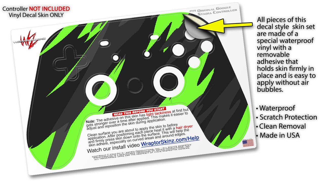This product is in no way affiliated with or endorsed by Google. WraptorSkinz® skin wraps work with the Original Google Stadia version 1 Controller. Printed using superb photo quality designs and vibrant colors printed with special fade resistant inks that last even in direct sun for years. WraptorSkinz are a composite of two layers of commercial grade materials. The bottom layer is a soft, flexible vinyl with a special removable adhesive that is easily positioned, applied without air bubbles. Next, we print the bottom layer with UV protected, fade resistant inks that deliver superb photo quality designs in vibrant colors. Finally, we bond a professional grade laminate over the entire skin adding a glossy protective finish.