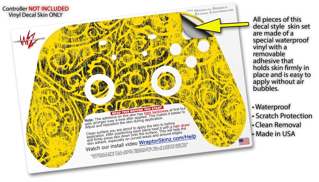 This product is in no way affiliated with or endorsed by Google. WraptorSkinz® skin wraps work with the Original Google Stadia version 1 Controller. Printed using superb photo quality designs and vibrant colors printed with special fade resistant inks that last even in direct sun for years. WraptorSkinz are a composite of two layers of commercial grade materials. The bottom layer is a soft, flexible vinyl with a special removable adhesive that is easily positioned, applied without air bubbles. Next, we print the bottom layer with UV protected, fade resistant inks that deliver superb photo quality designs in vibrant colors. Finally, we bond a professional grade laminate over the entire skin adding a glossy protective finish.