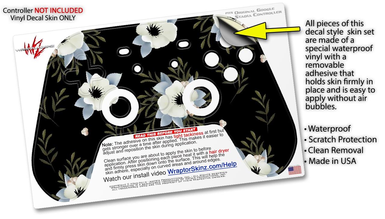 This product is in no way affiliated with or endorsed by Google. WraptorSkinz® skin wraps work with the Original Google Stadia version 1 Controller. Printed using superb photo quality designs and vibrant colors printed with special fade resistant inks that last even in direct sun for years. WraptorSkinz are a composite of two layers of commercial grade materials. The bottom layer is a soft, flexible vinyl with a special removable adhesive that is easily positioned, applied without air bubbles. Next, we print the bottom layer with UV protected, fade resistant inks that deliver superb photo quality designs in vibrant colors. Finally, we bond a professional grade laminate over the entire skin adding a glossy protective finish.
