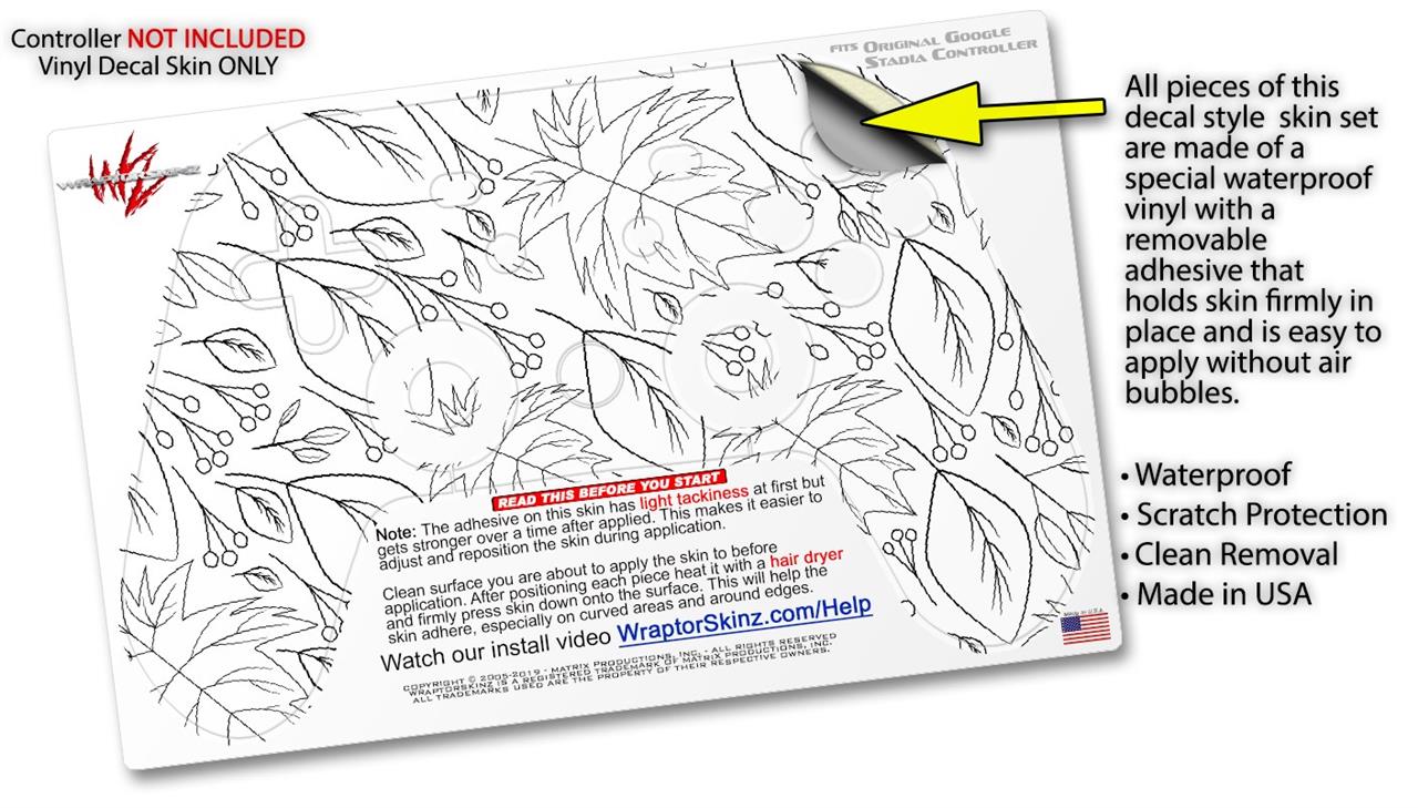 This product is in no way affiliated with or endorsed by Google. WraptorSkinz® skin wraps work with the Original Google Stadia version 1 Controller. Printed using superb photo quality designs and vibrant colors printed with special fade resistant inks that last even in direct sun for years. WraptorSkinz are a composite of two layers of commercial grade materials. The bottom layer is a soft, flexible vinyl with a special removable adhesive that is easily positioned, applied without air bubbles. Next, we print the bottom layer with UV protected, fade resistant inks that deliver superb photo quality designs in vibrant colors. Finally, we bond a professional grade laminate over the entire skin adding a glossy protective finish.