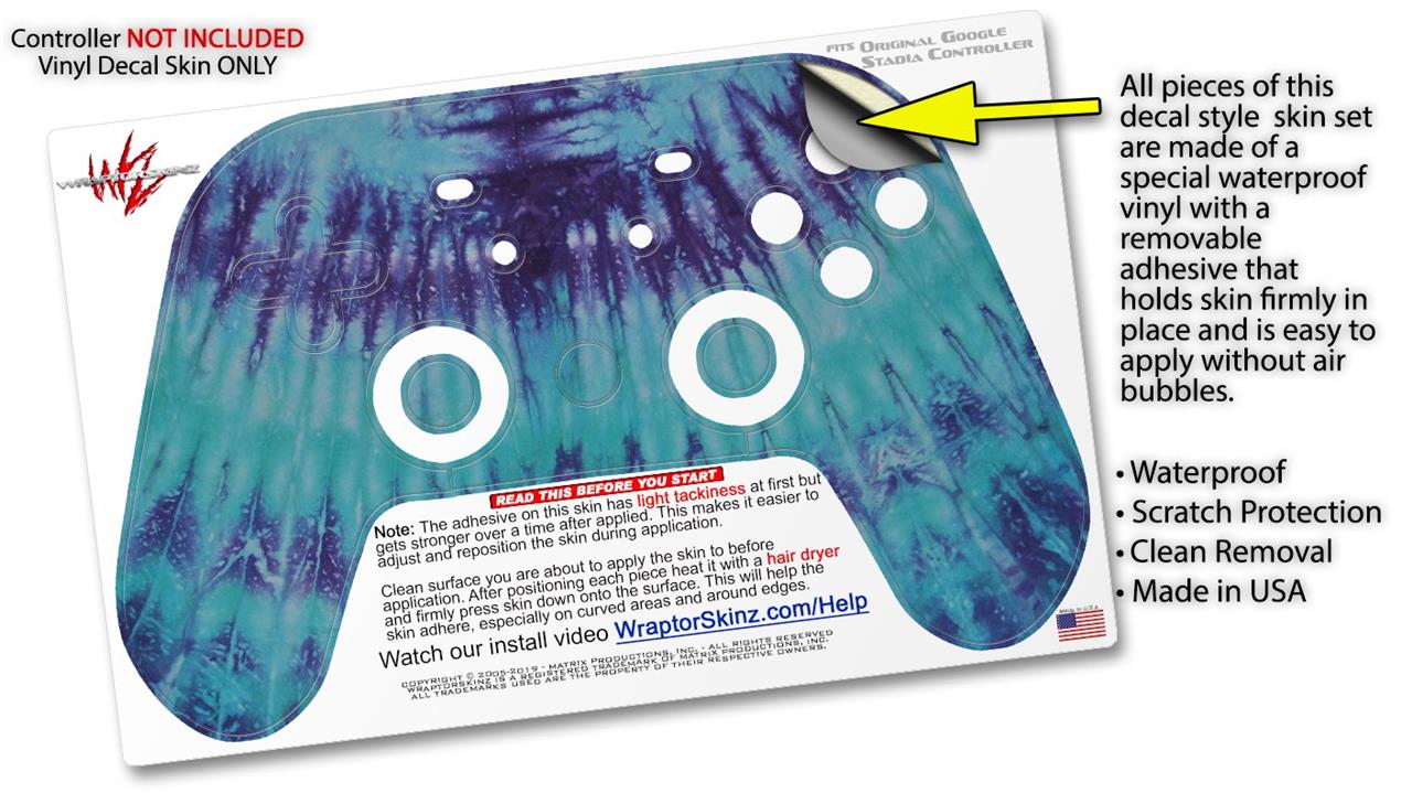 This product is in no way affiliated with or endorsed by Google. WraptorSkinz® skin wraps work with the Original Google Stadia version 1 Controller. Printed using superb photo quality designs and vibrant colors printed with special fade resistant inks that last even in direct sun for years. WraptorSkinz are a composite of two layers of commercial grade materials. The bottom layer is a soft, flexible vinyl with a special removable adhesive that is easily positioned, applied without air bubbles. Next, we print the bottom layer with UV protected, fade resistant inks that deliver superb photo quality designs in vibrant colors. Finally, we bond a professional grade laminate over the entire skin adding a glossy protective finish.