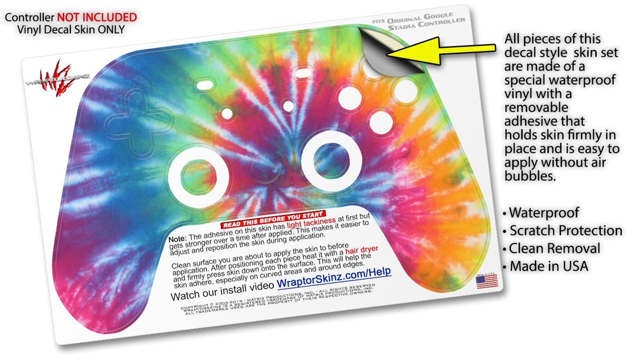 This product is in no way affiliated with or endorsed by Google. WraptorSkinz® skin wraps work with the Original Google Stadia version 1 Controller. Printed using superb photo quality designs and vibrant colors printed with special fade resistant inks that last even in direct sun for years. WraptorSkinz are a composite of two layers of commercial grade materials. The bottom layer is a soft, flexible vinyl with a special removable adhesive that is easily positioned, applied without air bubbles. Next, we print the bottom layer with UV protected, fade resistant inks that deliver superb photo quality designs in vibrant colors. Finally, we bond a professional grade laminate over the entire skin adding a glossy protective finish.
