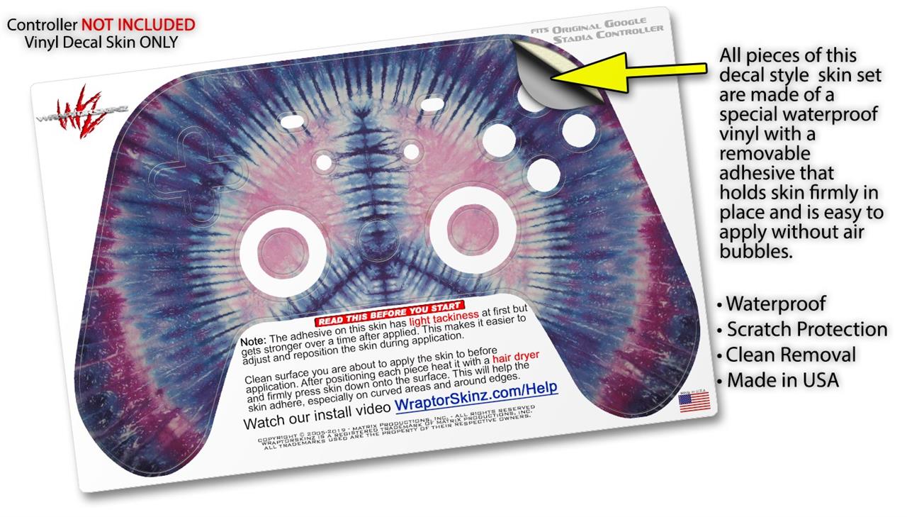 This product is in no way affiliated with or endorsed by Google. WraptorSkinz® skin wraps work with the Original Google Stadia version 1 Controller. Printed using superb photo quality designs and vibrant colors printed with special fade resistant inks that last even in direct sun for years. WraptorSkinz are a composite of two layers of commercial grade materials. The bottom layer is a soft, flexible vinyl with a special removable adhesive that is easily positioned, applied without air bubbles. Next, we print the bottom layer with UV protected, fade resistant inks that deliver superb photo quality designs in vibrant colors. Finally, we bond a professional grade laminate over the entire skin adding a glossy protective finish.