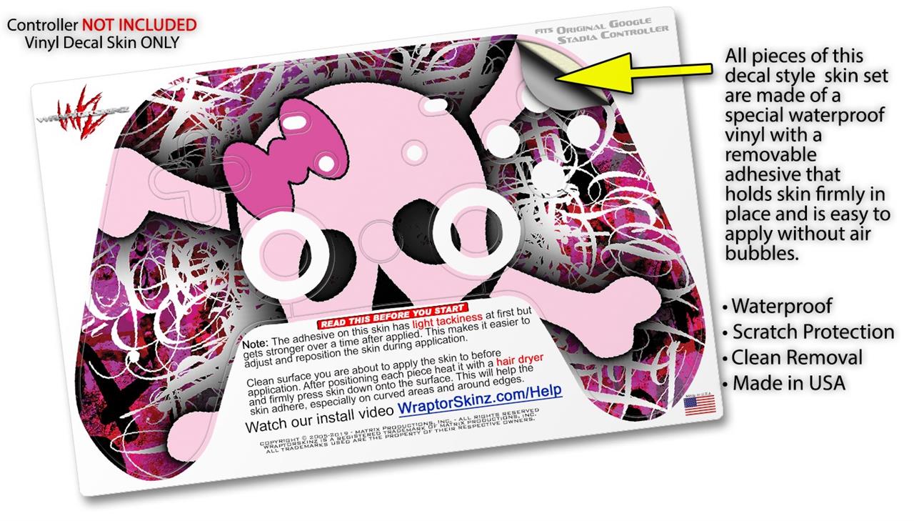 This product is in no way affiliated with or endorsed by Google. WraptorSkinz® skin wraps work with the Original Google Stadia version 1 Controller. Printed using superb photo quality designs and vibrant colors printed with special fade resistant inks that last even in direct sun for years. WraptorSkinz are a composite of two layers of commercial grade materials. The bottom layer is a soft, flexible vinyl with a special removable adhesive that is easily positioned, applied without air bubbles. Next, we print the bottom layer with UV protected, fade resistant inks that deliver superb photo quality designs in vibrant colors. Finally, we bond a professional grade laminate over the entire skin adding a glossy protective finish.