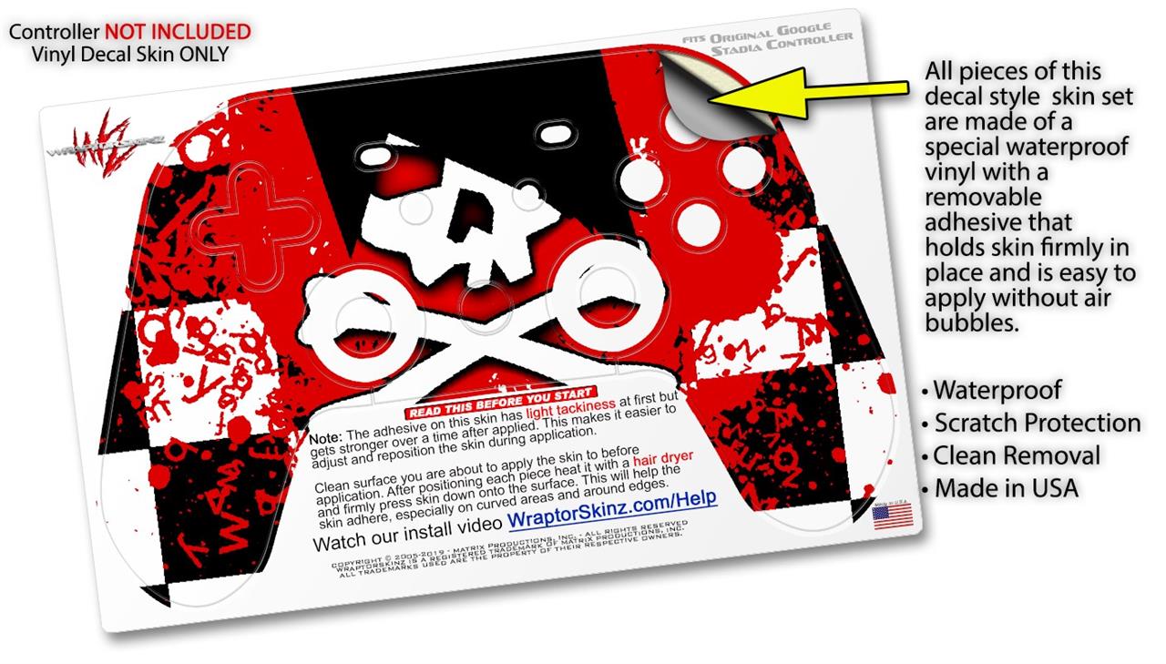 This product is in no way affiliated with or endorsed by Google. WraptorSkinz® skin wraps work with the Original Google Stadia version 1 Controller. Printed using superb photo quality designs and vibrant colors printed with special fade resistant inks that last even in direct sun for years. WraptorSkinz are a composite of two layers of commercial grade materials. The bottom layer is a soft, flexible vinyl with a special removable adhesive that is easily positioned, applied without air bubbles. Next, we print the bottom layer with UV protected, fade resistant inks that deliver superb photo quality designs in vibrant colors. Finally, we bond a professional grade laminate over the entire skin adding a glossy protective finish.