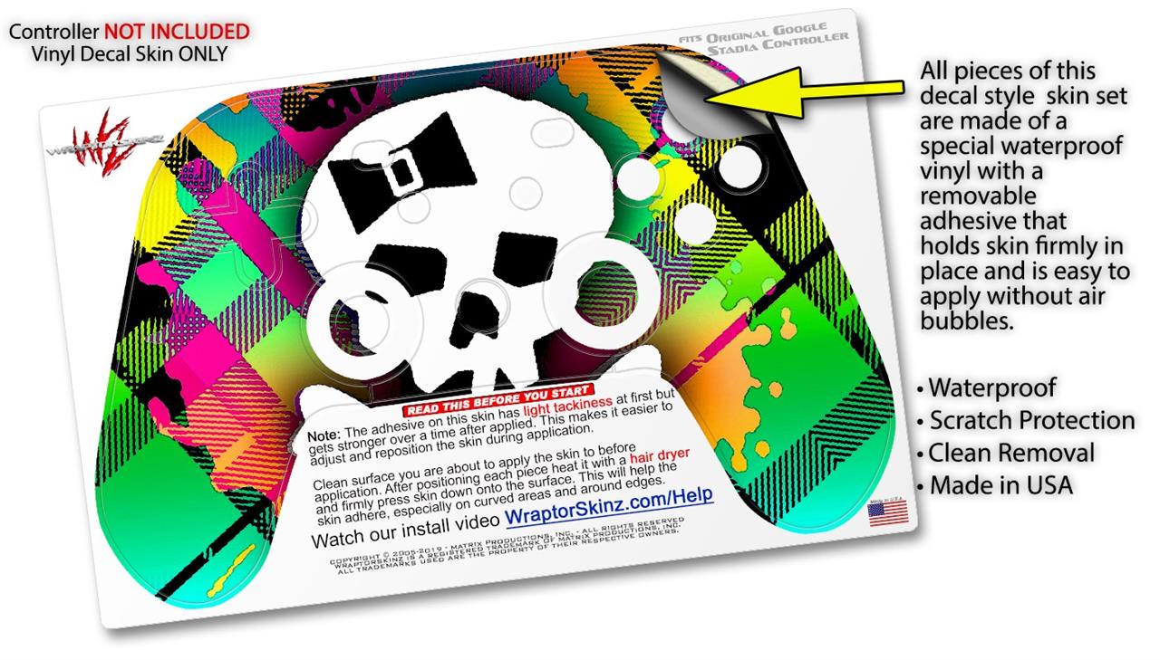 This product is in no way affiliated with or endorsed by Google. WraptorSkinz® skin wraps work with the Original Google Stadia version 1 Controller. Printed using superb photo quality designs and vibrant colors printed with special fade resistant inks that last even in direct sun for years. WraptorSkinz are a composite of two layers of commercial grade materials. The bottom layer is a soft, flexible vinyl with a special removable adhesive that is easily positioned, applied without air bubbles. Next, we print the bottom layer with UV protected, fade resistant inks that deliver superb photo quality designs in vibrant colors. Finally, we bond a professional grade laminate over the entire skin adding a glossy protective finish.