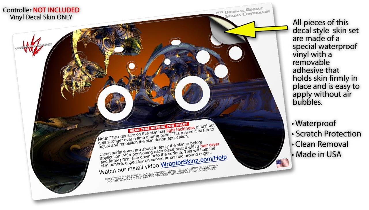 This product is in no way affiliated with or endorsed by Google. WraptorSkinz® skin wraps work with the Original Google Stadia version 1 Controller. Printed using superb photo quality designs and vibrant colors printed with special fade resistant inks that last even in direct sun for years. WraptorSkinz are a composite of two layers of commercial grade materials. The bottom layer is a soft, flexible vinyl with a special removable adhesive that is easily positioned, applied without air bubbles. Next, we print the bottom layer with UV protected, fade resistant inks that deliver superb photo quality designs in vibrant colors. Finally, we bond a professional grade laminate over the entire skin adding a glossy protective finish.