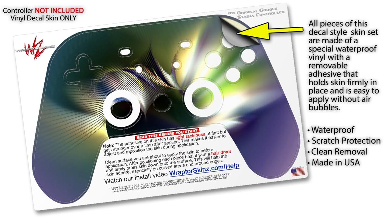 This product is in no way affiliated with or endorsed by Google. WraptorSkinz® skin wraps work with the Original Google Stadia version 1 Controller. Printed using superb photo quality designs and vibrant colors printed with special fade resistant inks that last even in direct sun for years. WraptorSkinz are a composite of two layers of commercial grade materials. The bottom layer is a soft, flexible vinyl with a special removable adhesive that is easily positioned, applied without air bubbles. Next, we print the bottom layer with UV protected, fade resistant inks that deliver superb photo quality designs in vibrant colors. Finally, we bond a professional grade laminate over the entire skin adding a glossy protective finish.