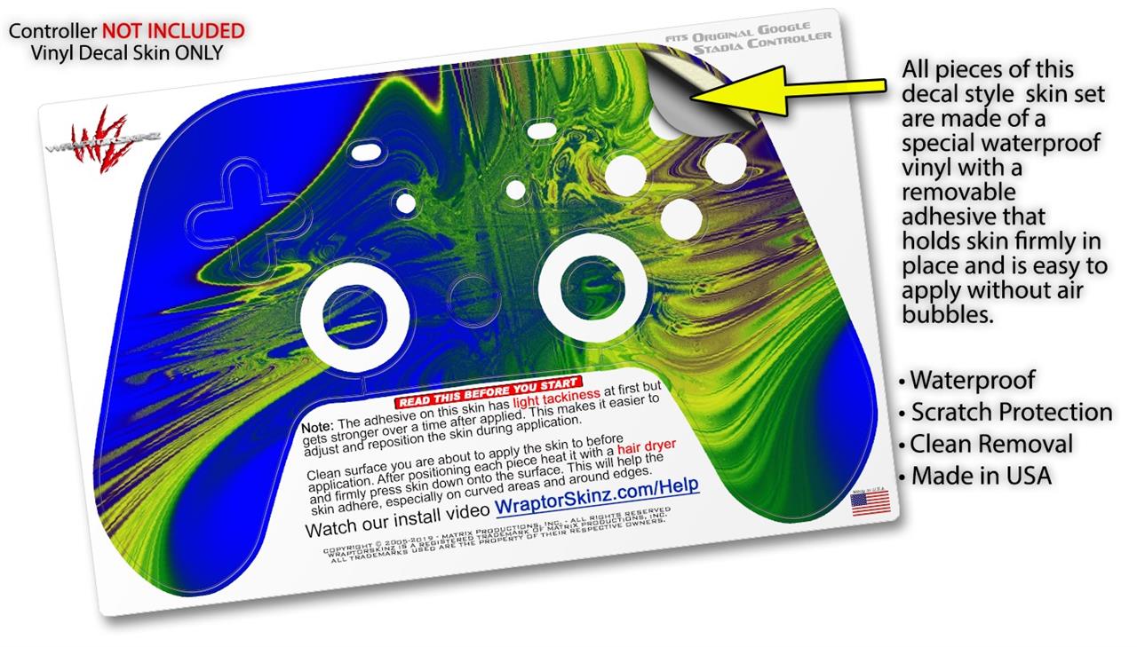 This product is in no way affiliated with or endorsed by Google. WraptorSkinz® skin wraps work with the Original Google Stadia version 1 Controller. Printed using superb photo quality designs and vibrant colors printed with special fade resistant inks that last even in direct sun for years. WraptorSkinz are a composite of two layers of commercial grade materials. The bottom layer is a soft, flexible vinyl with a special removable adhesive that is easily positioned, applied without air bubbles. Next, we print the bottom layer with UV protected, fade resistant inks that deliver superb photo quality designs in vibrant colors. Finally, we bond a professional grade laminate over the entire skin adding a glossy protective finish.