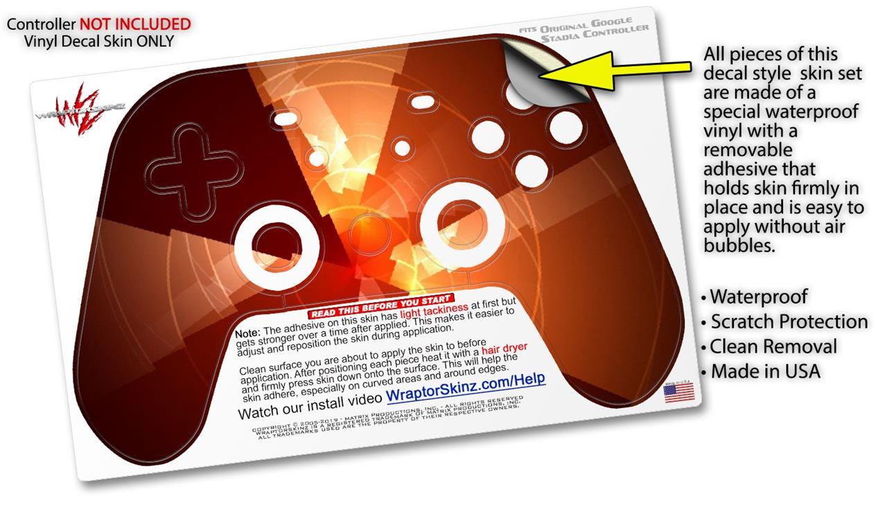 This product is in no way affiliated with or endorsed by Google. WraptorSkinz® skin wraps work with the Original Google Stadia version 1 Controller. Printed using superb photo quality designs and vibrant colors printed with special fade resistant inks that last even in direct sun for years. WraptorSkinz are a composite of two layers of commercial grade materials. The bottom layer is a soft, flexible vinyl with a special removable adhesive that is easily positioned, applied without air bubbles. Next, we print the bottom layer with UV protected, fade resistant inks that deliver superb photo quality designs in vibrant colors. Finally, we bond a professional grade laminate over the entire skin adding a glossy protective finish.
