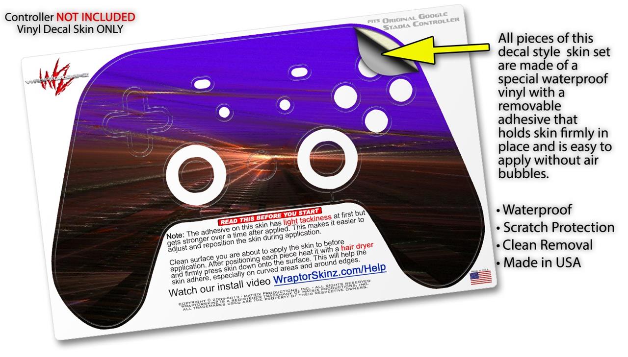 This product is in no way affiliated with or endorsed by Google. WraptorSkinz® skin wraps work with the Original Google Stadia version 1 Controller. Printed using superb photo quality designs and vibrant colors printed with special fade resistant inks that last even in direct sun for years. WraptorSkinz are a composite of two layers of commercial grade materials. The bottom layer is a soft, flexible vinyl with a special removable adhesive that is easily positioned, applied without air bubbles. Next, we print the bottom layer with UV protected, fade resistant inks that deliver superb photo quality designs in vibrant colors. Finally, we bond a professional grade laminate over the entire skin adding a glossy protective finish.