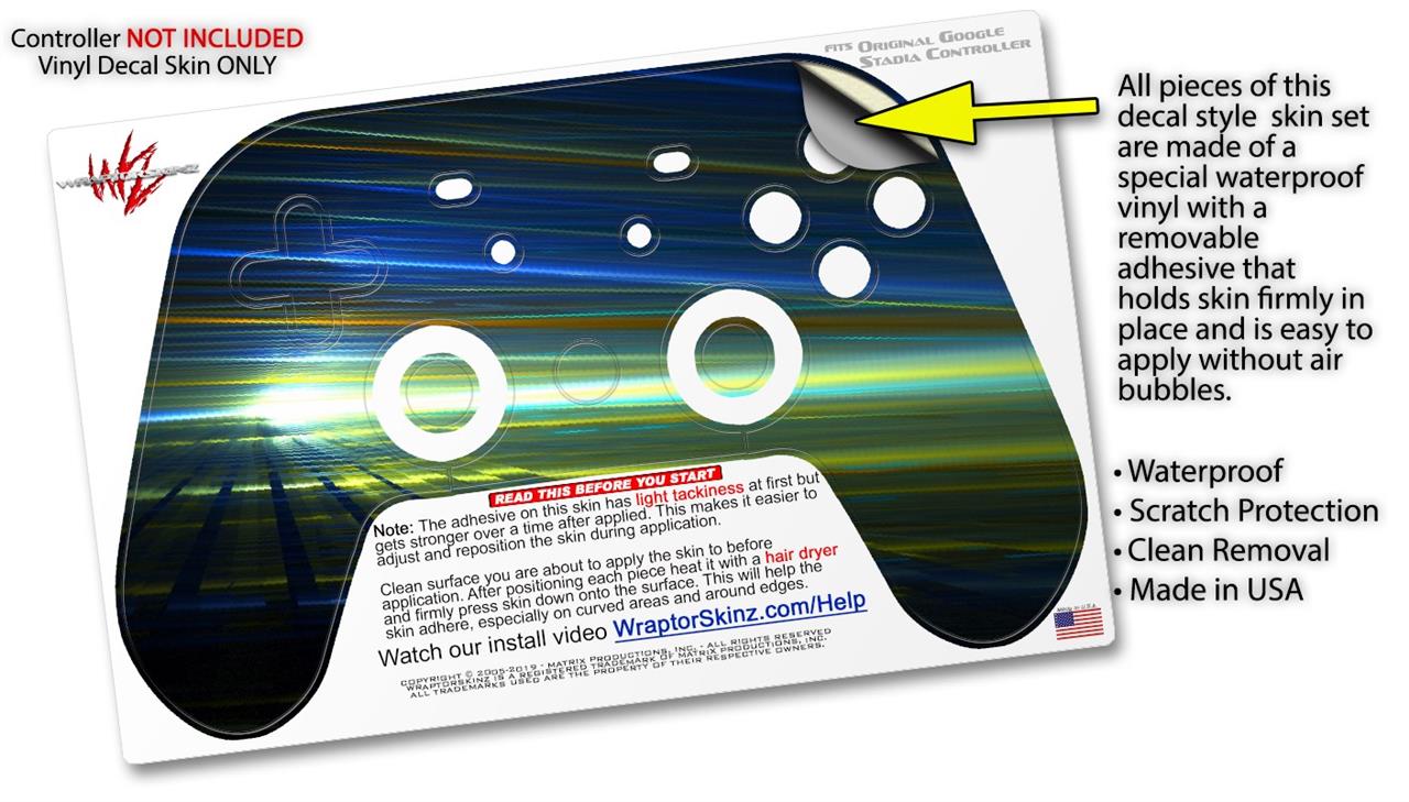 This product is in no way affiliated with or endorsed by Google. WraptorSkinz® skin wraps work with the Original Google Stadia version 1 Controller. Printed using superb photo quality designs and vibrant colors printed with special fade resistant inks that last even in direct sun for years. WraptorSkinz are a composite of two layers of commercial grade materials. The bottom layer is a soft, flexible vinyl with a special removable adhesive that is easily positioned, applied without air bubbles. Next, we print the bottom layer with UV protected, fade resistant inks that deliver superb photo quality designs in vibrant colors. Finally, we bond a professional grade laminate over the entire skin adding a glossy protective finish.