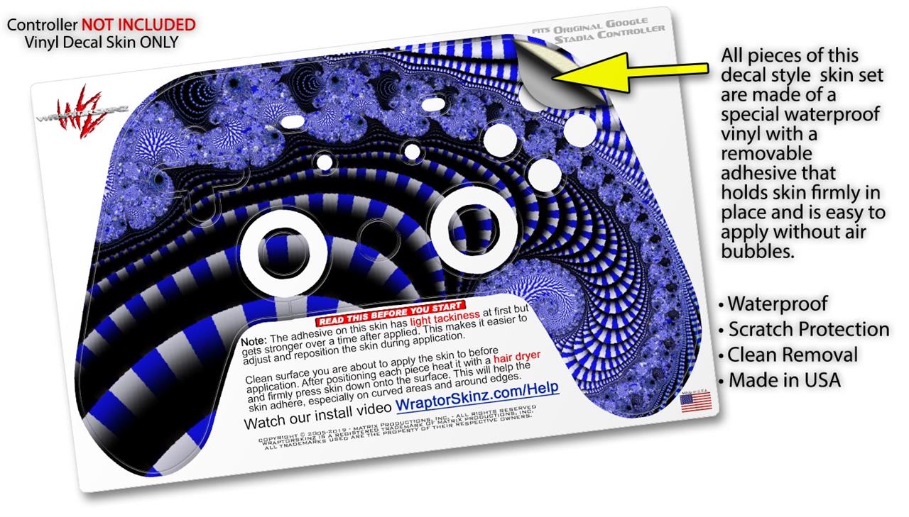 This product is in no way affiliated with or endorsed by Google. WraptorSkinz® skin wraps work with the Original Google Stadia version 1 Controller. Printed using superb photo quality designs and vibrant colors printed with special fade resistant inks that last even in direct sun for years. WraptorSkinz are a composite of two layers of commercial grade materials. The bottom layer is a soft, flexible vinyl with a special removable adhesive that is easily positioned, applied without air bubbles. Next, we print the bottom layer with UV protected, fade resistant inks that deliver superb photo quality designs in vibrant colors. Finally, we bond a professional grade laminate over the entire skin adding a glossy protective finish.