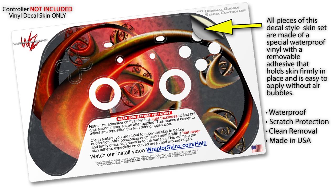 This product is in no way affiliated with or endorsed by Google. WraptorSkinz® skin wraps work with the Original Google Stadia version 1 Controller. Printed using superb photo quality designs and vibrant colors printed with special fade resistant inks that last even in direct sun for years. WraptorSkinz are a composite of two layers of commercial grade materials. The bottom layer is a soft, flexible vinyl with a special removable adhesive that is easily positioned, applied without air bubbles. Next, we print the bottom layer with UV protected, fade resistant inks that deliver superb photo quality designs in vibrant colors. Finally, we bond a professional grade laminate over the entire skin adding a glossy protective finish.