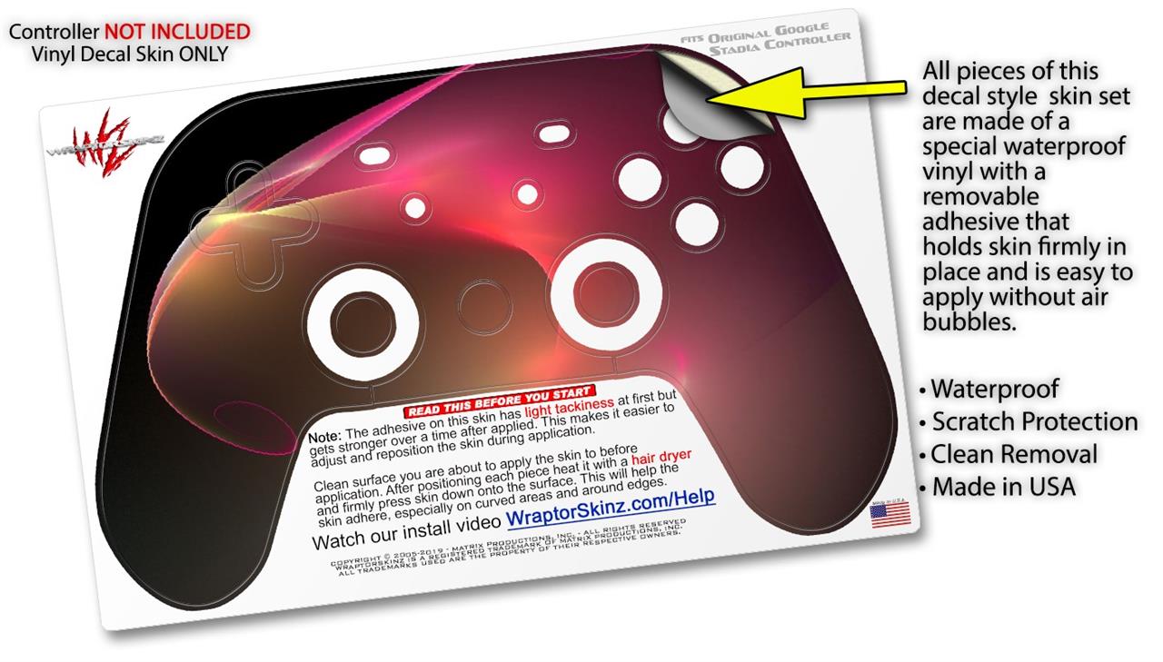 This product is in no way affiliated with or endorsed by Google. WraptorSkinz® skin wraps work with the Original Google Stadia version 1 Controller. Printed using superb photo quality designs and vibrant colors printed with special fade resistant inks that last even in direct sun for years. WraptorSkinz are a composite of two layers of commercial grade materials. The bottom layer is a soft, flexible vinyl with a special removable adhesive that is easily positioned, applied without air bubbles. Next, we print the bottom layer with UV protected, fade resistant inks that deliver superb photo quality designs in vibrant colors. Finally, we bond a professional grade laminate over the entire skin adding a glossy protective finish.