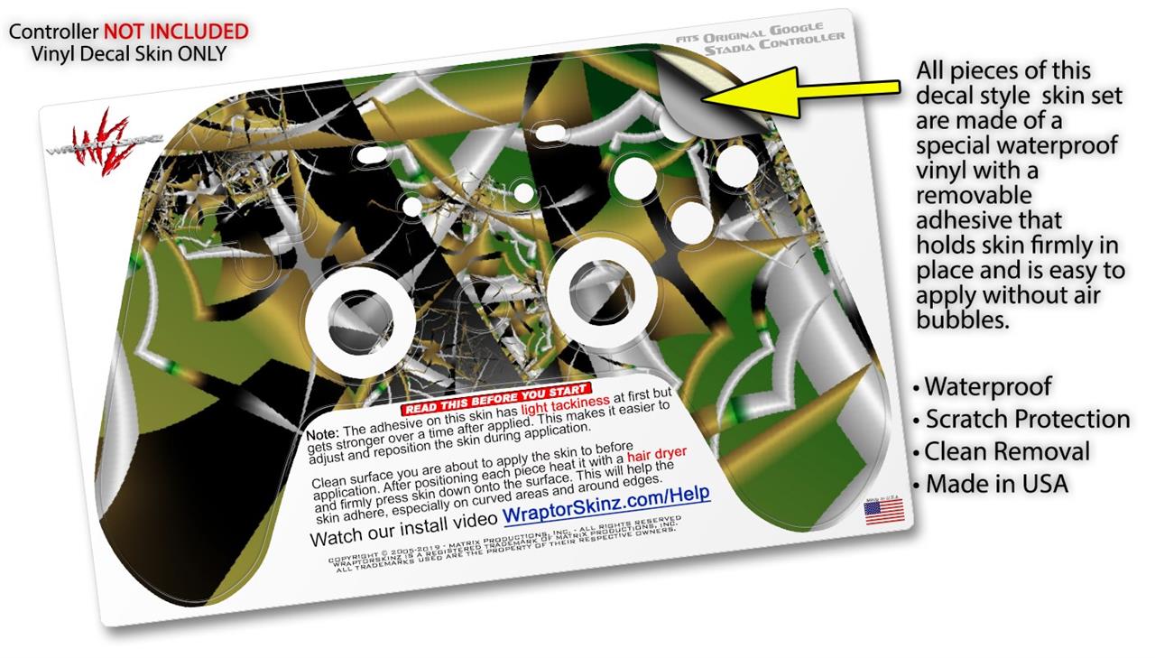 This product is in no way affiliated with or endorsed by Google. WraptorSkinz® skin wraps work with the Original Google Stadia version 1 Controller. Printed using superb photo quality designs and vibrant colors printed with special fade resistant inks that last even in direct sun for years. WraptorSkinz are a composite of two layers of commercial grade materials. The bottom layer is a soft, flexible vinyl with a special removable adhesive that is easily positioned, applied without air bubbles. Next, we print the bottom layer with UV protected, fade resistant inks that deliver superb photo quality designs in vibrant colors. Finally, we bond a professional grade laminate over the entire skin adding a glossy protective finish.
