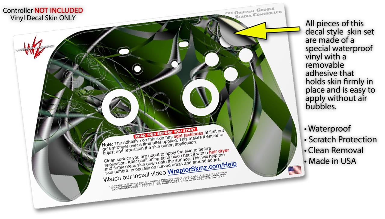 This product is in no way affiliated with or endorsed by Google. WraptorSkinz® skin wraps work with the Original Google Stadia version 1 Controller. Printed using superb photo quality designs and vibrant colors printed with special fade resistant inks that last even in direct sun for years. WraptorSkinz are a composite of two layers of commercial grade materials. The bottom layer is a soft, flexible vinyl with a special removable adhesive that is easily positioned, applied without air bubbles. Next, we print the bottom layer with UV protected, fade resistant inks that deliver superb photo quality designs in vibrant colors. Finally, we bond a professional grade laminate over the entire skin adding a glossy protective finish.