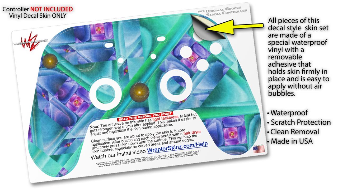 This product is in no way affiliated with or endorsed by Google. WraptorSkinz® skin wraps work with the Original Google Stadia version 1 Controller. Printed using superb photo quality designs and vibrant colors printed with special fade resistant inks that last even in direct sun for years. WraptorSkinz are a composite of two layers of commercial grade materials. The bottom layer is a soft, flexible vinyl with a special removable adhesive that is easily positioned, applied without air bubbles. Next, we print the bottom layer with UV protected, fade resistant inks that deliver superb photo quality designs in vibrant colors. Finally, we bond a professional grade laminate over the entire skin adding a glossy protective finish.