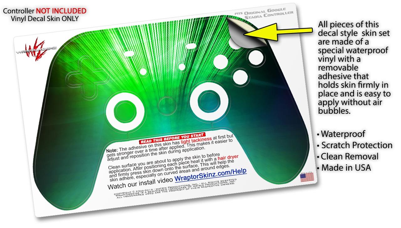This product is in no way affiliated with or endorsed by Google. WraptorSkinz® skin wraps work with the Original Google Stadia version 1 Controller. Printed using superb photo quality designs and vibrant colors printed with special fade resistant inks that last even in direct sun for years. WraptorSkinz are a composite of two layers of commercial grade materials. The bottom layer is a soft, flexible vinyl with a special removable adhesive that is easily positioned, applied without air bubbles. Next, we print the bottom layer with UV protected, fade resistant inks that deliver superb photo quality designs in vibrant colors. Finally, we bond a professional grade laminate over the entire skin adding a glossy protective finish.
