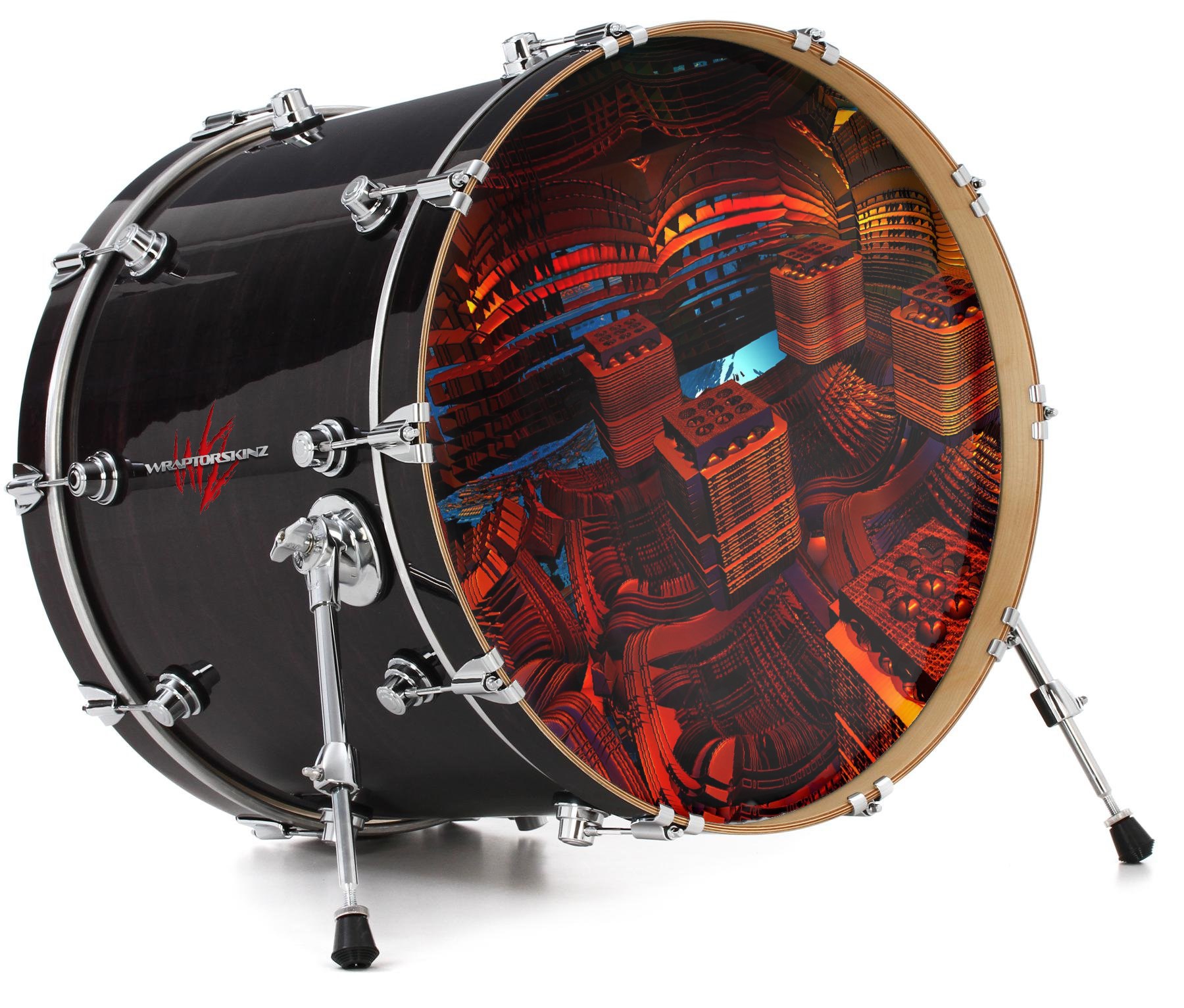 This design also available in other sizes. WraptorSkinz® skin wraps compatible with most kick drum heads. Printed using superb photo quality designs and vibrant colors printed with special fade resistant inks that last even in direct sun for years. WraptorSkinz are a composite three layer commercial grade materials vinyl. The bottom layer is a air release, grey block out removable adhesive that hides existing graphics on the drum head and is easily applied without air bubbles. The middle layer is a flexible vinyl printed with UV protected, fade resistant inks that deliver superb photo quality designs in vibrant colors. Finally, we bond a professional grade laminate over the entire skin adding a glossy protective finish.