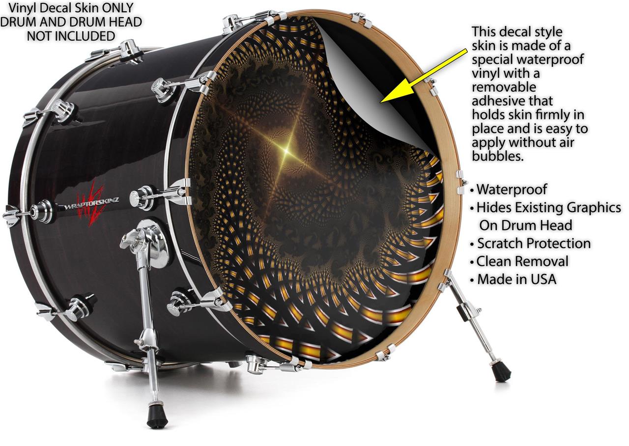 This design also available in other sizes. WraptorSkinz® skin wraps compatible with most kick drum heads. Printed using superb photo quality designs and vibrant colors printed with special fade resistant inks that last even in direct sun for years. WraptorSkinz are a composite three layer commercial grade materials vinyl. The bottom layer is a air release, grey block out removable adhesive that hides existing graphics on the drum head and is easily applied without air bubbles. The middle layer is a flexible vinyl printed with UV protected, fade resistant inks that deliver superb photo quality designs in vibrant colors. Finally, we bond a professional grade laminate over the entire skin adding a glossy protective finish.