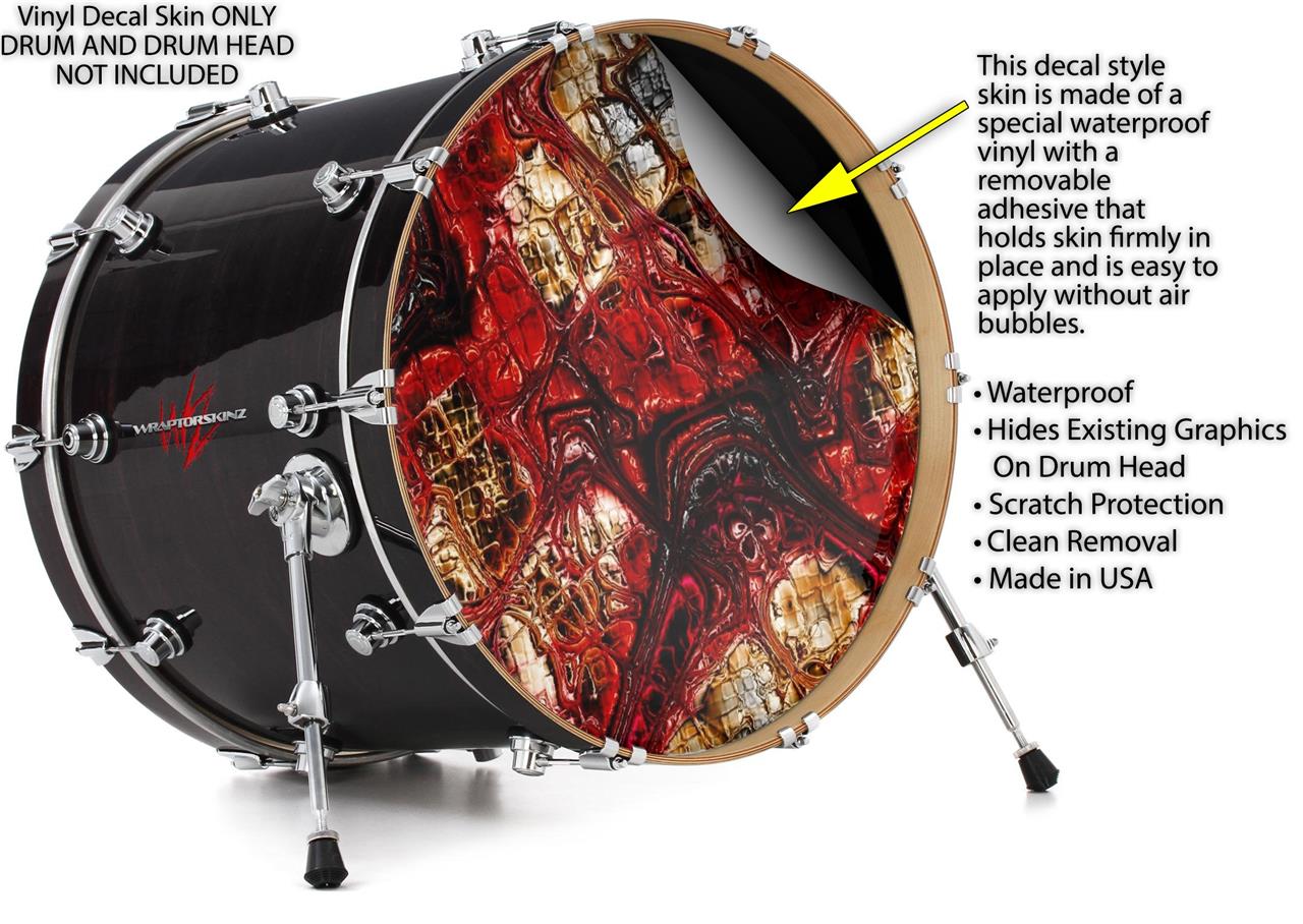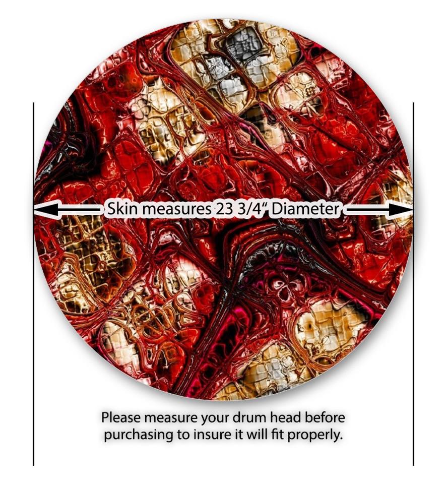 This design also available in other sizes. WraptorSkinz® skin wraps compatible with most kick drum heads. Printed using superb photo quality designs and vibrant colors printed with special fade resistant inks that last even in direct sun for years. WraptorSkinz are a composite three layer commercial grade materials vinyl. The bottom layer is a air release, grey block out removable adhesive that hides existing graphics on the drum head and is easily applied without air bubbles. The middle layer is a flexible vinyl printed with UV protected, fade resistant inks that deliver superb photo quality designs in vibrant colors. Finally, we bond a professional grade laminate over the entire skin adding a glossy protective finish.