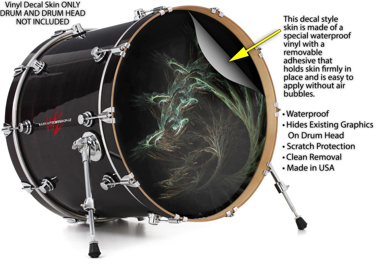 This design also available in other sizes. WraptorSkinz® skin wraps compatible with most kick drum heads. Printed using superb photo quality designs and vibrant colors printed with special fade resistant inks that last even in direct sun for years. WraptorSkinz are a composite three layer commercial grade materials vinyl. The bottom layer is a air release, grey block out removable adhesive that hides existing graphics on the drum head and is easily applied without air bubbles. The middle layer is a flexible vinyl printed with UV protected, fade resistant inks that deliver superb photo quality designs in vibrant colors. Finally, we bond a professional grade laminate over the entire skin adding a glossy protective finish.