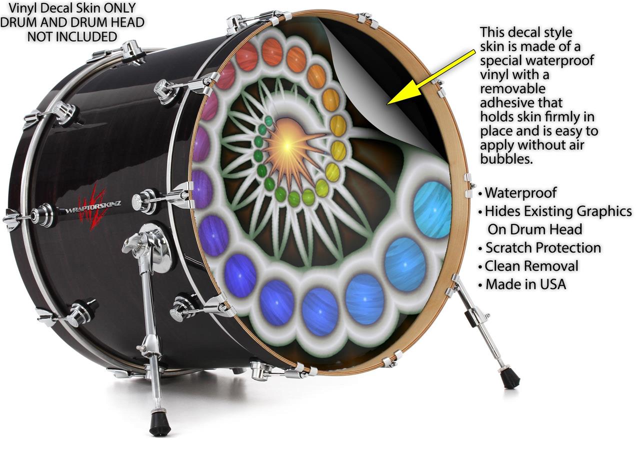 This design also available in other sizes. WraptorSkinz® skin wraps compatible with most kick drum heads. Printed using superb photo quality designs and vibrant colors printed with special fade resistant inks that last even in direct sun for years. WraptorSkinz are a composite three layer commercial grade materials vinyl. The bottom layer is a air release, grey block out removable adhesive that hides existing graphics on the drum head and is easily applied without air bubbles. The middle layer is a flexible vinyl printed with UV protected, fade resistant inks that deliver superb photo quality designs in vibrant colors. Finally, we bond a professional grade laminate over the entire skin adding a glossy protective finish.