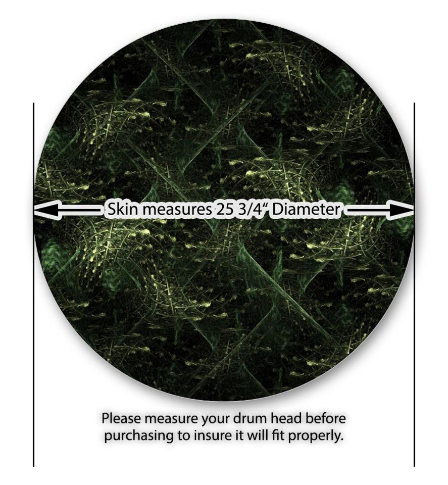 This design also available in other sizes. WraptorSkinz® skin wraps compatible with most kick drum heads. Printed using superb photo quality designs and vibrant colors printed with special fade resistant inks that last even in direct sun for years. WraptorSkinz are a composite three layer commercial grade materials vinyl. The bottom layer is a air release, grey block out removable adhesive that hides existing graphics on the drum head and is easily applied without air bubbles. The middle layer is a flexible vinyl printed with UV protected, fade resistant inks that deliver superb photo quality designs in vibrant colors. Finally, we bond a professional grade laminate over the entire skin adding a glossy protective finish.