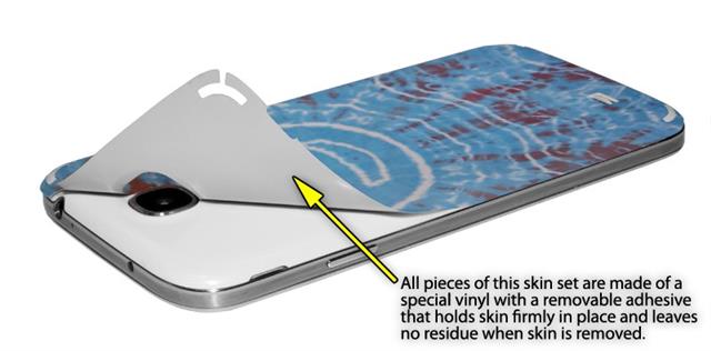 • Decal style vinyl skin covers front and back of Samsung Galaxy S4 phone.