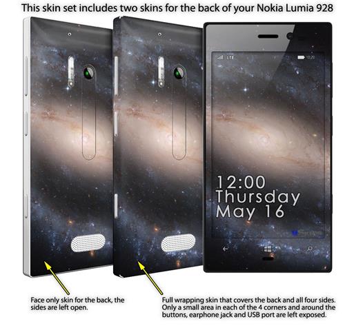 • Decal style vinyl skin covers front, back and side of Nokia Lumia 928 phone.