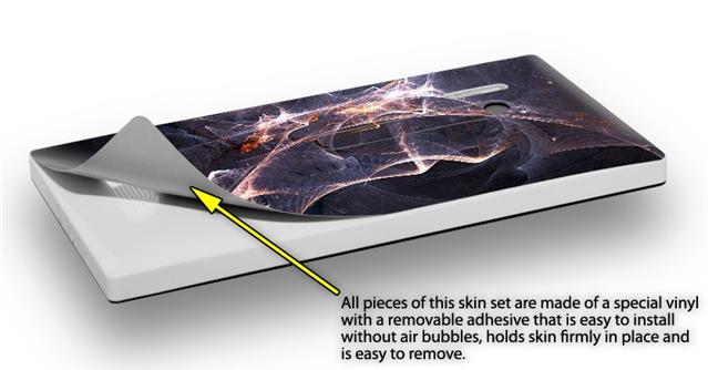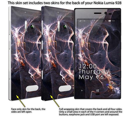 • Decal style vinyl skin covers front, back and side of Nokia Lumia 928 phone.