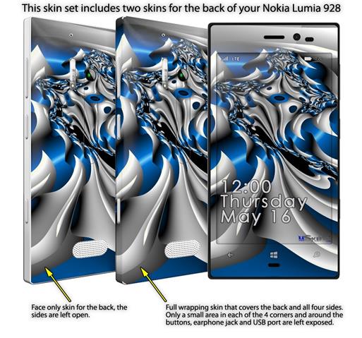 • Decal style vinyl skin covers front, back and side of Nokia Lumia 928 phone.