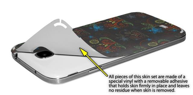 • Decal style vinyl skin covers front and back of Samsung Galaxy S4 phone.