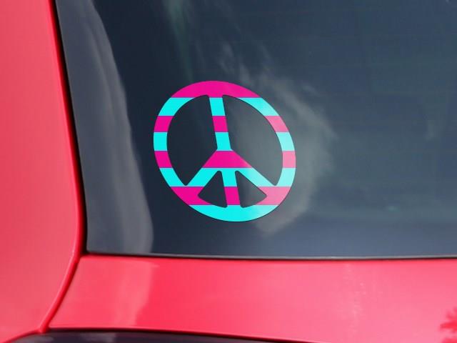 Psycho Stripes Neon Teal and Hot Pink - Peace Sign Car Window Decal 6 x 6 inches
